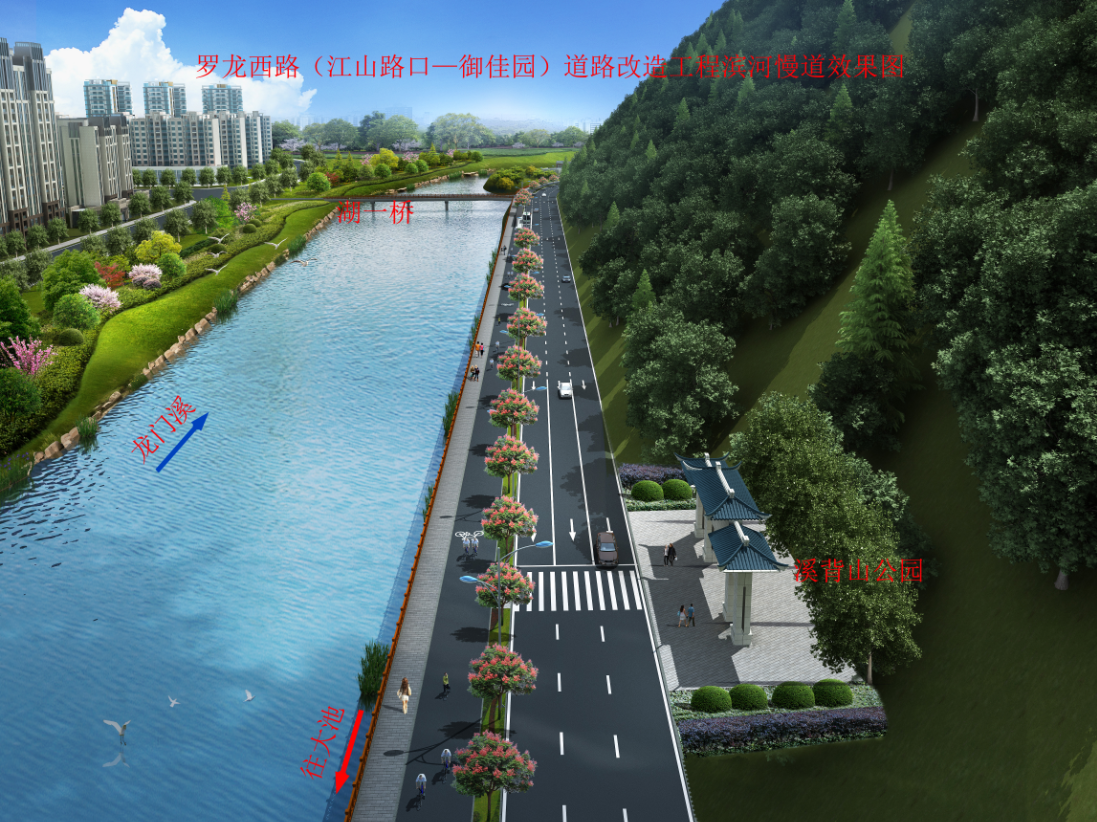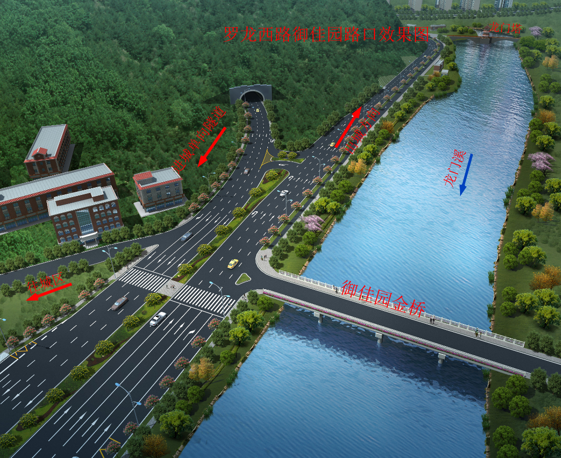 羅龍西路是連接龍巖西高速出入口與中心城市的唯一通道,其規(guī)劃改造范圍從紅竹山橋至御佳園路口,全長3855米,計劃將原道路拓寬至40米,實(shí)行雙向六車道,兩旁設(shè)2.5米非機(jī)動車道,并在湖二橋路口以東設(shè)640米入城單向三車道隧道連接至御佳園路口,原羅龍西路湖二橋至御佳園段將調(diào)整為出城單向車道。