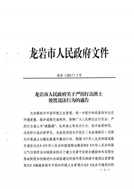 1. 龍巖市人民政府關(guān)于嚴(yán)厲打擊渣土處置違法行為的通告(通告【2017】3號)