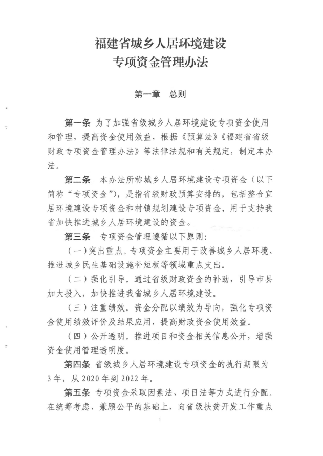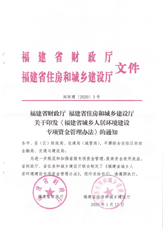 1. 福建省財政廳福建省住房和城鄉(xiāng)建設(shè)廳關(guān)于印發(fā)《福建省城鄉(xiāng)人居環(huán)境建設(shè)專項資金管理辦法的通知》(閩財建[2020]3號)