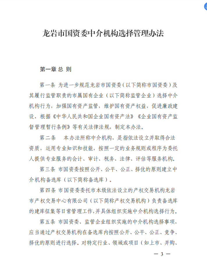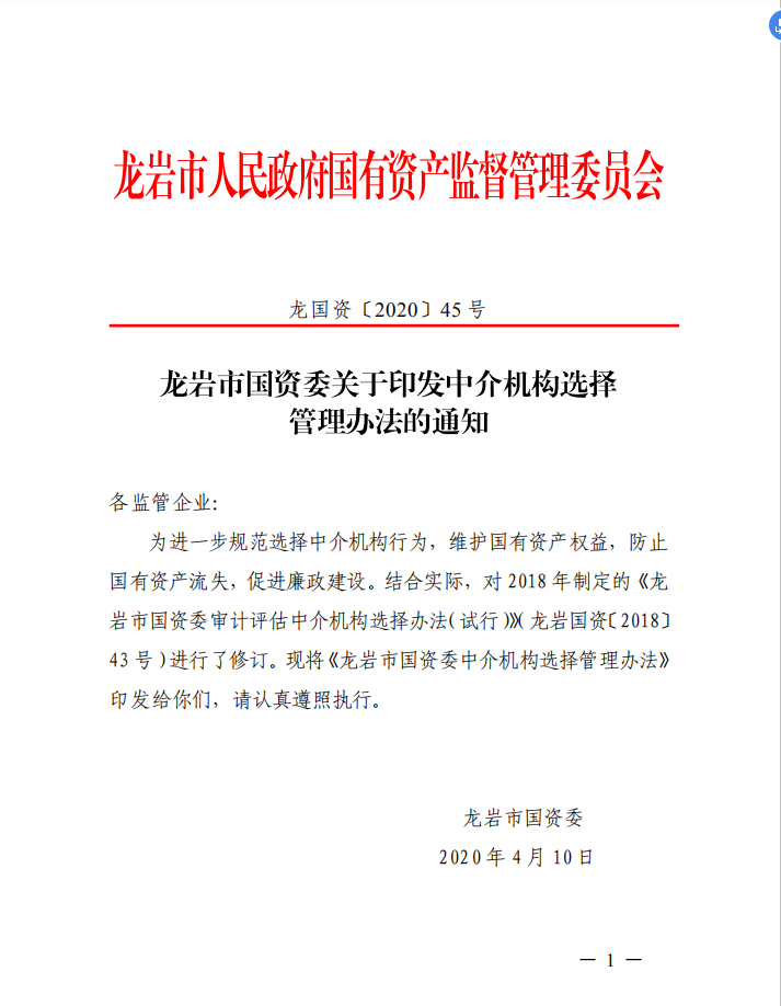 1. 龍巖市國資委關(guān)于印發(fā)中介機(jī)構(gòu)選擇管理辦法的通知(龍國資[2020]45號)