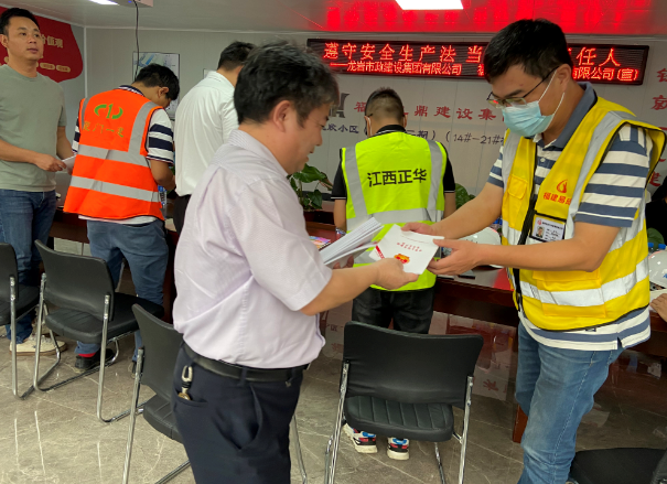 現(xiàn)場(chǎng)徐旺興董事長、修海金副總經(jīng)理分別向項(xiàng)目部人員及工人現(xiàn)場(chǎng)分發(fā)《安全生產(chǎn)法》及“五進(jìn)”等宣傳資料。